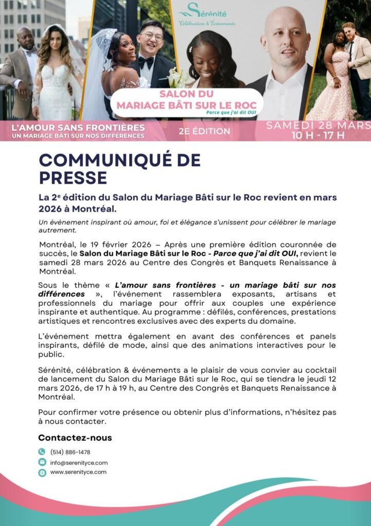 La 2e édition du Salon du Mariage Bâti sur le Roc – Parce que j’ai dit OUI se tiendra le 28 mars 2026 à Montréal.